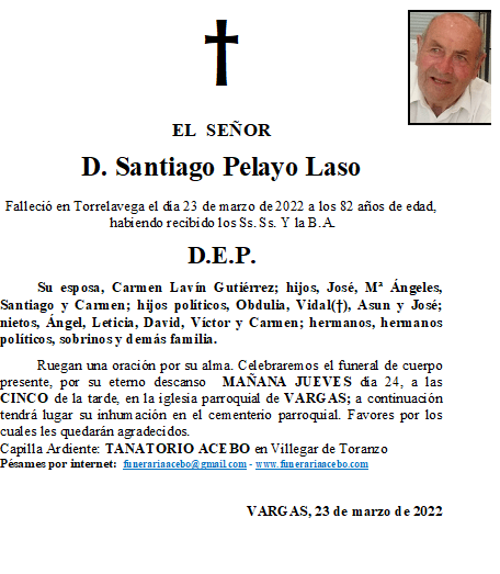 D. Santiago Pelayo Laso- Vargas en 23 marzo, 2022 por funerariaacebo Comparte esto: Haz clic para compartir en X (Se abre en una ventana nueva) X Haz clic para compartir en Facebook (Se abre en una ventana nueva) Facebook Me gusta Cargando... Relacionado