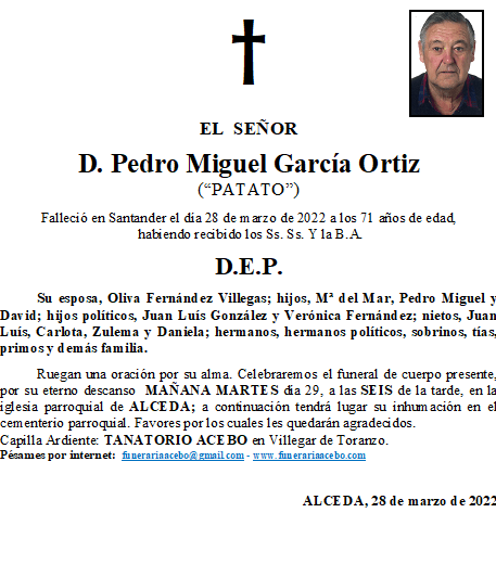D. Pedro Miguel García Ortiz («Patato»)- Alceda en 28 marzo, 2022 por funerariaacebo Comparte esto: Haz clic para compartir en X (Se abre en una ventana nueva) X Haz clic para compartir en Facebook (Se abre en una ventana nueva) Facebook Me gusta Cargando... Relacionado