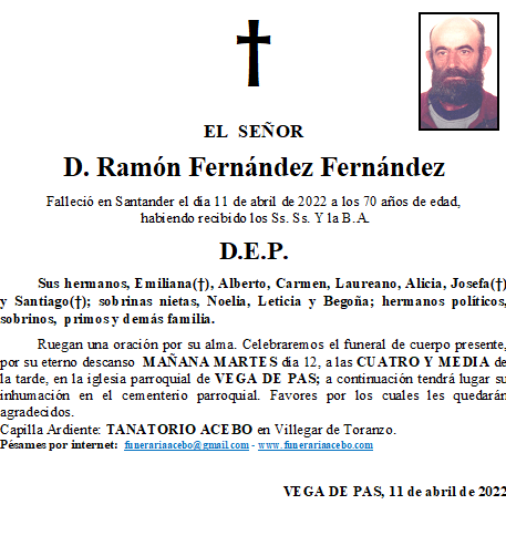 D. Ramón Fernández Fernández- Vega de Pas en 11 abril, 2022 por funerariaacebo Comparte esto: Haz clic para compartir en X (Se abre en una ventana nueva) X Haz clic para compartir en Facebook (Se abre en una ventana nueva) Facebook Me gusta Cargando... Relacionado