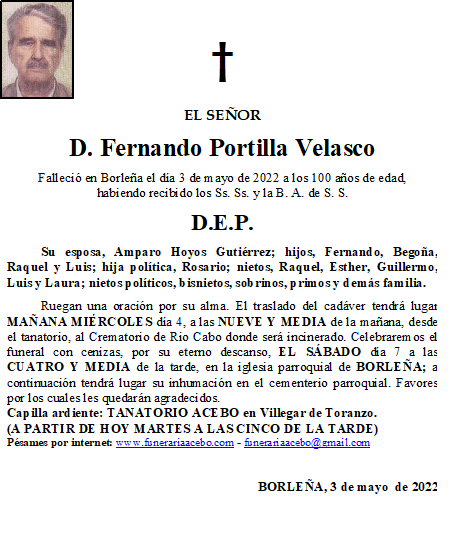 D. Fernando Portilla Velasco- Borleña en 3 mayo, 2022 por funerariaacebo Comparte esto: Compartir en X (Se abre en una ventana nueva) X Comparte en Facebook (Se abre en una ventana nueva) Facebook Me gusta Cargando... Relacionado