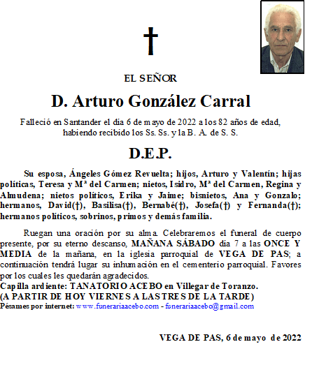 D. Arturo González Carral- Vega de Pas en 6 mayo, 2022 por funerariaacebo Comparte esto: Haz clic para compartir en X (Se abre en una ventana nueva) X Haz clic para compartir en Facebook (Se abre en una ventana nueva) Facebook Me gusta Cargando... Relacionado
