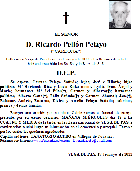 D. Ricardo Pellón Pelayo- Vega de Pas en 17 mayo, 2022 por funerariaacebo Comparte esto: Haz clic para compartir en X (Se abre en una ventana nueva) X Haz clic para compartir en Facebook (Se abre en una ventana nueva) Facebook Me gusta Cargando... Relacionado