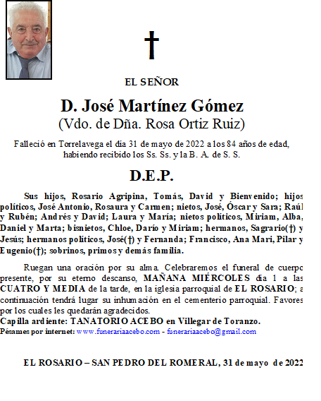 D. José Martínez Gómez- El Rosario- San Pedro del Romeral en 31 mayo, 2022 por funerariaacebo Comparte esto: Compartir en X (Se abre en una ventana nueva) X Comparte en Facebook (Se abre en una ventana nueva) Facebook Me gusta Cargando... Relacionado
