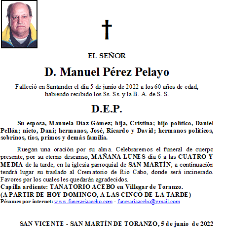 D. Manuel Pérez Pelayo- San Vicente- San Martín de Toranzo en 5 junio, 2022 por funerariaacebo Comparte esto: Haz clic para compartir en X (Se abre en una ventana nueva) X Haz clic para compartir en Facebook (Se abre en una ventana nueva) Facebook Me gusta Cargando... Relacionado