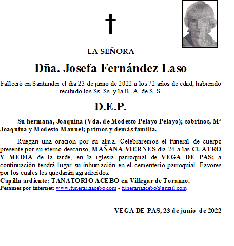 Dña. Josefa Fernández Laso- Vega de Pas en 23 junio, 2022 por funerariaacebo Comparte esto: Haz clic para compartir en X (Se abre en una ventana nueva) X Haz clic para compartir en Facebook (Se abre en una ventana nueva) Facebook Me gusta Cargando... Relacionado