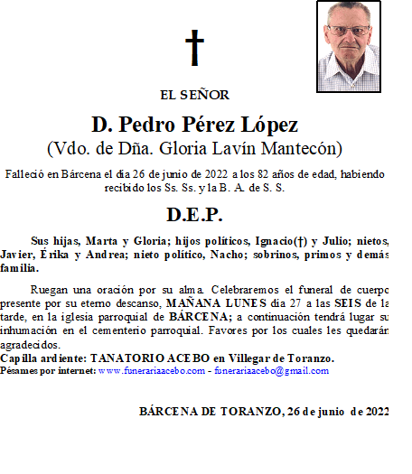 D. Pedro Pérez López- Bárcena de Toranzo en 26 junio, 2022 por funerariaacebo Comparte esto: Haz clic para compartir en X (Se abre en una ventana nueva) X Haz clic para compartir en Facebook (Se abre en una ventana nueva) Facebook Me gusta Cargando... Relacionado