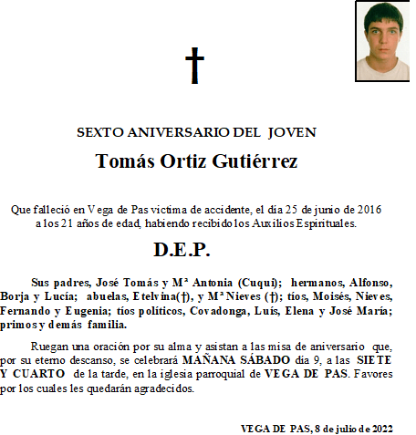 Aniversario de Tomás Ortiz Gutiérrez-Vega de Pas en 8 julio, 2022 por funerariaacebo Comparte esto: Haz clic para compartir en X (Se abre en una ventana nueva) X Haz clic para compartir en Facebook (Se abre en una ventana nueva) Facebook Me gusta Cargando... Relacionado