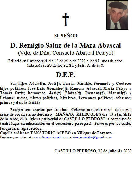 funerariaacebo@gmail.com Sentimos mucho la pérdida de Remigio y no enterarnos. Os enviamos nuestro más sentido pésame. Un fuerte abrazo para toda la familia. Enviado desde mi GalaxyM.Carmen Morante y Ramiro
