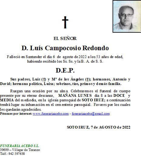 D. Luís Campocosio Redondo – Soto Iruz. en 7 agosto, 2022 por funerariaacebo Comparte esto: Haz clic para compartir en X (Se abre en una ventana nueva) X Haz clic para compartir en Facebook (Se abre en una ventana nueva) Facebook Me gusta Cargando... Relacionado