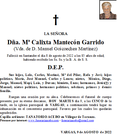 Dña. Mª Calixta Mantecón Garrido – Vargas. en 9 agosto, 2022 por funerariaacebo Comparte esto: Haz clic para compartir en X (Se abre en una ventana nueva) X Haz clic para compartir en Facebook (Se abre en una ventana nueva) Facebook Me gusta Cargando... Relacionado