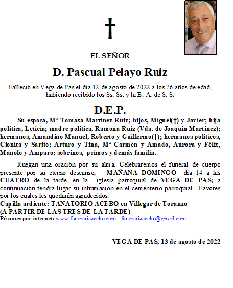 D. Pascual Pelayo Ruiz- Vega de Pas en 13 agosto, 2022 por funerariaacebo Comparte esto: Haz clic para compartir en X (Se abre en una ventana nueva) X Haz clic para compartir en Facebook (Se abre en una ventana nueva) Facebook Me gusta Cargando... Relacionado