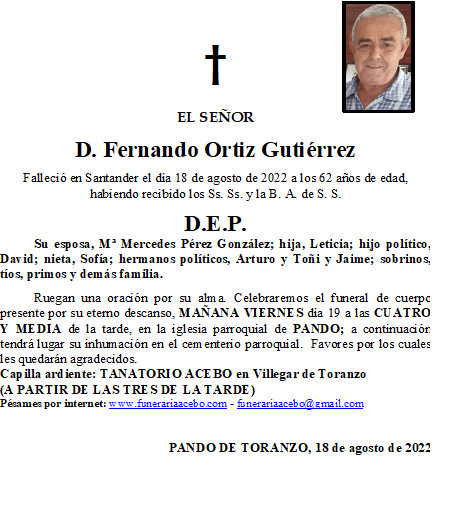 D. Fernando Ortiz Gutiérrez- Pando de Toranzo en 18 agosto, 2022 por funerariaacebo Comparte esto: Haz clic para compartir en X (Se abre en una ventana nueva) X Haz clic para compartir en Facebook (Se abre en una ventana nueva) Facebook Me gusta Cargando... Relacionado