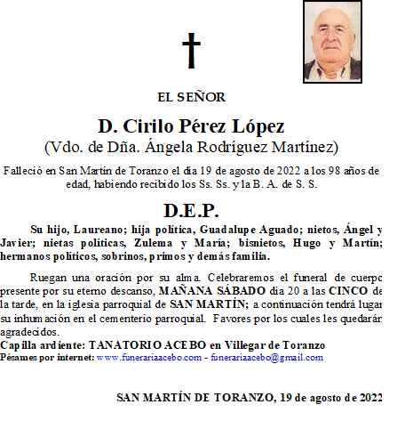 D. Cirilo Pérez López- San Martín de Toranzo en 19 agosto, 2022 por funerariaacebo Comparte esto: Haz clic para compartir en X (Se abre en una ventana nueva) X Haz clic para compartir en Facebook (Se abre en una ventana nueva) Facebook Me gusta Cargando... Relacionado