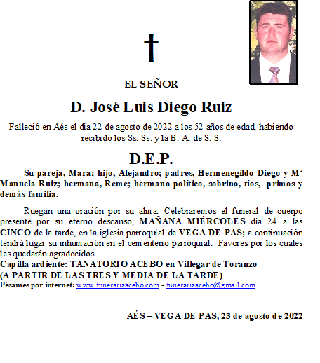 D. José Luis Diego Ruiz- Aés- Vega de Pas en 23 agosto, 2022 por funerariaacebo Comparte esto: Haz clic para compartir en X (Se abre en una ventana nueva) X Haz clic para compartir en Facebook (Se abre en una ventana nueva) Facebook Me gusta Cargando... Relacionado
