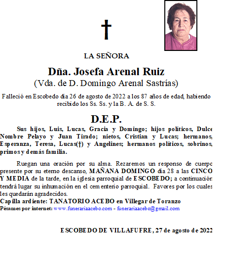 Dña. Josefa Arenal Ruiz- Escobedo de Villafufre en 27 agosto, 2022 por funerariaacebo Comparte esto: Haz clic para compartir en X (Se abre en una ventana nueva) X Haz clic para compartir en Facebook (Se abre en una ventana nueva) Facebook Me gusta Cargando... Relacionado