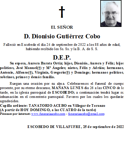 D. Dionisio Gutiérrez Cobo- Escobedo de Villafufre en 25 septiembre, 2022 por funerariaacebo Comparte esto: Haz clic para compartir en X (Se abre en una ventana nueva) X Haz clic para compartir en Facebook (Se abre en una ventana nueva) Facebook Me gusta Cargando... Relacionado
