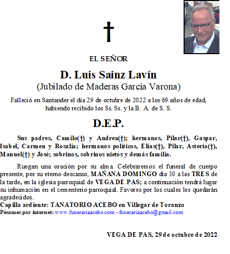 D. Luis Sainz Lavín- Vega de Pas en 29 octubre, 2022 por funerariaacebo Comparte esto: Haz clic para compartir en X (Se abre en una ventana nueva) X Haz clic para compartir en Facebook (Se abre en una ventana nueva) Facebook Me gusta Cargando... Relacionado