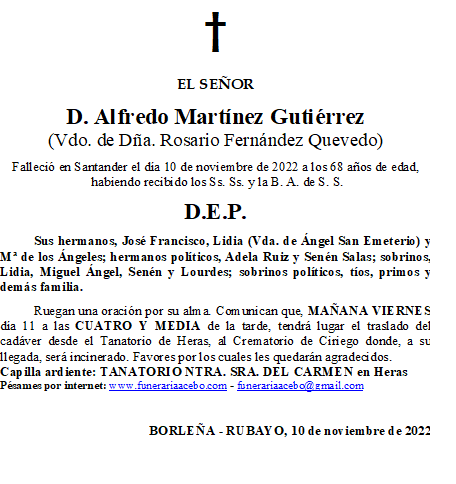 D. Alfredo Martínez Gutiérrez – Borleña- Rubayo en 10 noviembre, 2022 por funerariaacebo Comparte esto: Haz clic para compartir en X (Se abre en una ventana nueva) X Haz clic para compartir en Facebook (Se abre en una ventana nueva) Facebook Me gusta Cargando... Relacionado