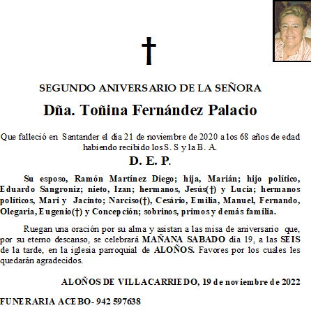 Segundo Aniversario- Dña. Toñina Fernández Palacio en 18 noviembre, 2022 por funerariaacebo Comparte esto: Haz clic para compartir en X (Se abre en una ventana nueva) X Haz clic para compartir en Facebook (Se abre en una ventana nueva) Facebook Me gusta Cargando... Relacionado