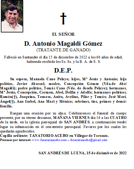 D. Antonio Magaldi Gómez – San Andrés de Luena en 15 diciembre, 2022 por funerariaacebo Comparte esto: Haz clic para compartir en X (Se abre en una ventana nueva) X Haz clic para compartir en Facebook (Se abre en una ventana nueva) Facebook Me gusta Cargando... Relacionado