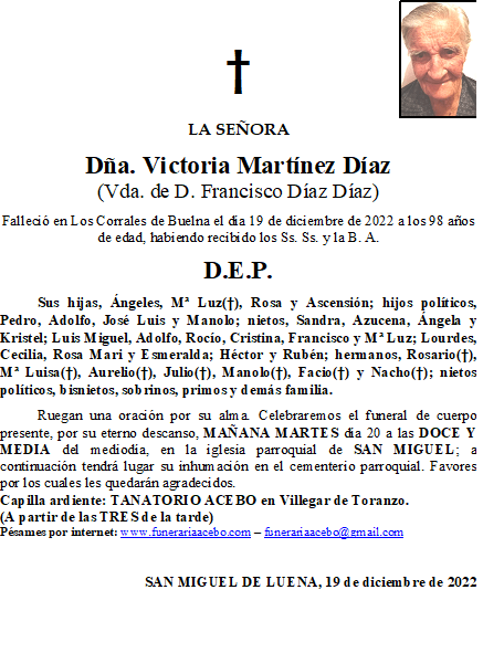 Dña. Victoria Martínez Díaz- San Miguel de Luena en 19 diciembre, 2022 por funerariaacebo Comparte esto: Haz clic para compartir en X (Se abre en una ventana nueva) X Haz clic para compartir en Facebook (Se abre en una ventana nueva) Facebook Me gusta Cargando... Relacionado