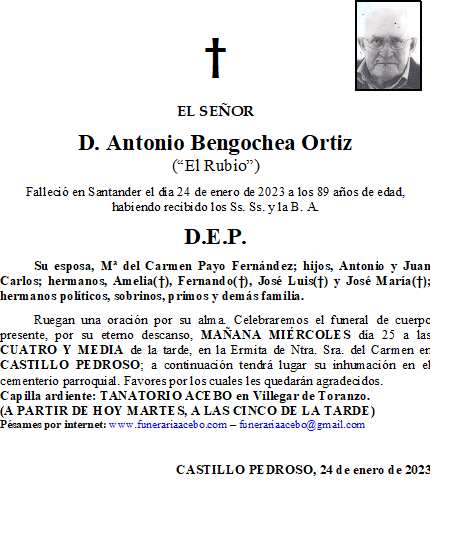 D. Antonio Bengochea Ortiz (El Rubio)- Castillo Pedroso en 24 enero, 2023 por funerariaacebo Comparte esto: Haz clic para compartir en X (Se abre en una ventana nueva) X Haz clic para compartir en Facebook (Se abre en una ventana nueva) Facebook Me gusta Cargando... Relacionado