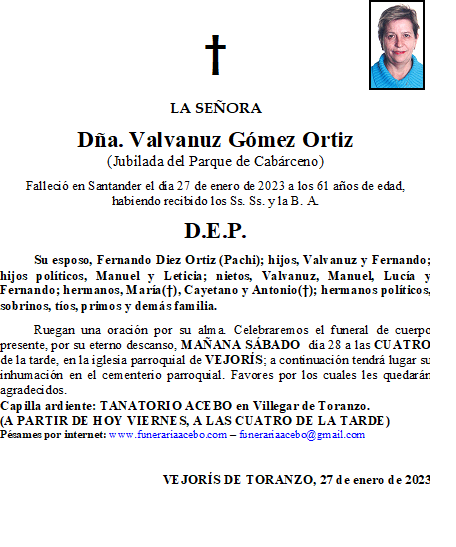 Dña. Valvanuz Gómez Ortiz- Vejorís en 27 enero, 2023 por funerariaacebo Comparte esto: Haz clic para compartir en X (Se abre en una ventana nueva) X Haz clic para compartir en Facebook (Se abre en una ventana nueva) Facebook Me gusta Cargando... Relacionado