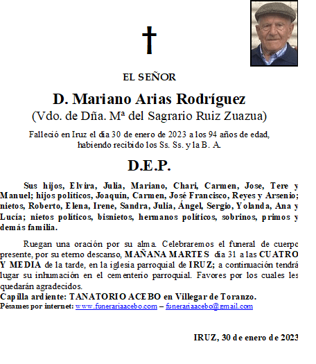 D. Mariano Arias Rodríguez- Iruz en 30 enero, 2023 por funerariaacebo Comparte esto: Haz clic para compartir en X (Se abre en una ventana nueva) X Haz clic para compartir en Facebook (Se abre en una ventana nueva) Facebook Me gusta Cargando... Relacionado