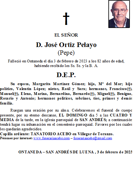 D. José Ortiz Pelayo (Pepe) – Ontaneda- San Andrés de Luena en 3 febrero, 2023 por funerariaacebo Comparte esto: Haz clic para compartir en X (Se abre en una ventana nueva) X Haz clic para compartir en Facebook (Se abre en una ventana nueva) Facebook Me gusta Cargando... Relacionado