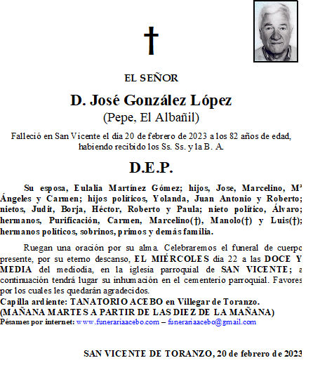 D. José González López – San Vicente de Toranzo en 20 febrero, 2023 por funerariaacebo Comparte esto: Haz clic para compartir en X (Se abre en una ventana nueva) X Haz clic para compartir en Facebook (Se abre en una ventana nueva) Facebook Me gusta Cargando... Relacionado
