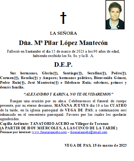 Dña. Mª Pilar López Mantecón- Vega de Pas en 15 marzo, 2023 por funerariaacebo Comparte esto: Haz clic para compartir en X (Se abre en una ventana nueva) X Haz clic para compartir en Facebook (Se abre en una ventana nueva) Facebook Me gusta Cargando... Relacionado