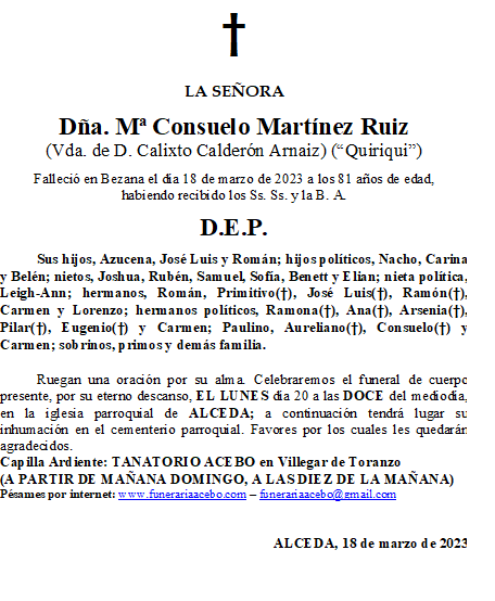 Condolencias Enviado desde mi GalaxySentimos mucho el fallecimiento de Consuelo. Nuestro más sentido pésame para toda la familia. Un abrazo .Estamos de viaje