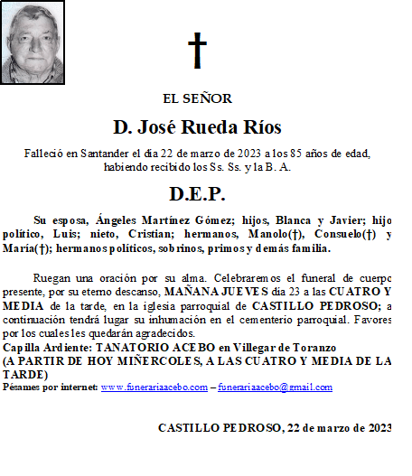 D. José Rueda Ríos- Castillo Pedroso en 22 marzo, 2023 por funerariaacebo Comparte esto: Haz clic para compartir en X (Se abre en una ventana nueva) X Haz clic para compartir en Facebook (Se abre en una ventana nueva) Facebook Me gusta Cargando... Relacionado
