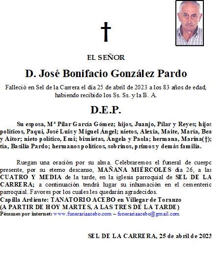 D. José Bonifacio González Pardo- Sel de la Carrera en 25 abril, 2023 por funerariaacebo Comparte esto: Haz clic para compartir en X (Se abre en una ventana nueva) X Haz clic para compartir en Facebook (Se abre en una ventana nueva) Facebook Me gusta Cargando... Relacionado