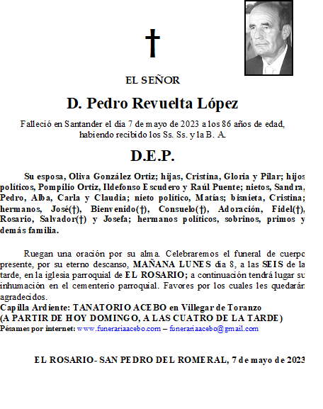 D. Pedro Revuelta López- El Rosario- San Pedro del Romeral en 7 mayo, 2023 por funerariaacebo Comparte esto: Haz clic para compartir en X (Se abre en una ventana nueva) X Haz clic para compartir en Facebook (Se abre en una ventana nueva) Facebook Me gusta Cargando... Relacionado