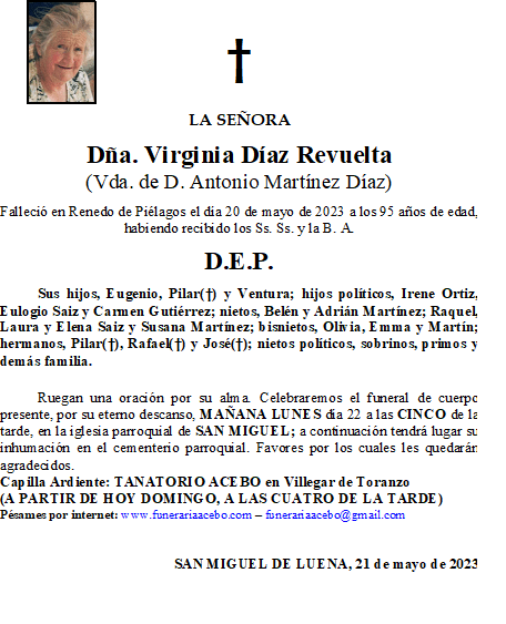 Dña. Virginia Díaz Revuelta- San Miguel de Luena en 21 mayo, 2023 por funerariaacebo Comparte esto: Haz clic para compartir en X (Se abre en una ventana nueva) X Haz clic para compartir en Facebook (Se abre en una ventana nueva) Facebook Me gusta Cargando... Relacionado