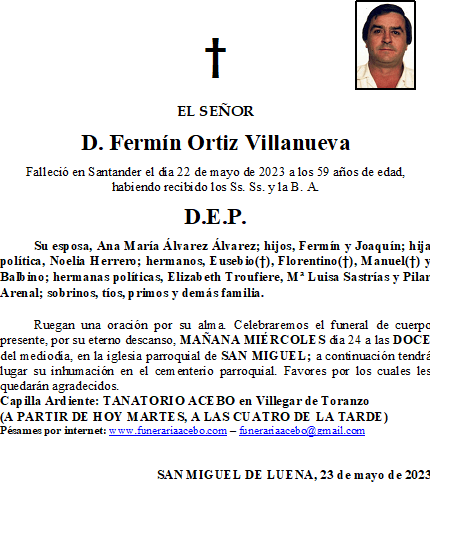 D. Fermín Ortiz Villanueva- San Miguel de Luena en 23 mayo, 2023 por funerariaacebo Comparte esto: Haz clic para compartir en X (Se abre en una ventana nueva) X Haz clic para compartir en Facebook (Se abre en una ventana nueva) Facebook Me gusta Cargando... Relacionado