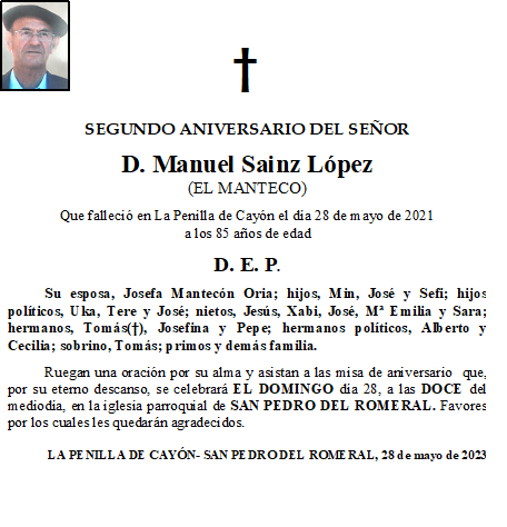 2º Aniversario- D. Manuel Sainz López- San Pedro del Romeral en 25 mayo, 2023 por funerariaacebo Comparte esto: Haz clic para compartir en X (Se abre en una ventana nueva) X Haz clic para compartir en Facebook (Se abre en una ventana nueva) Facebook Me gusta Cargando... Relacionado