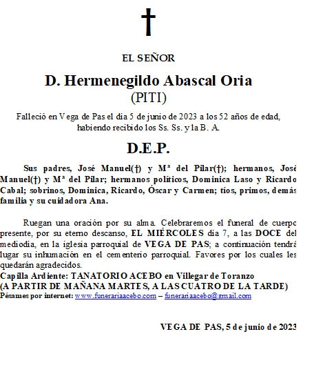 D. Hermenegildo Abascal Oria (Piti)- Vega de Pas en 5 junio, 20235 junio, 2023 por funerariaacebo Comparte esto: Haz clic para compartir en X (Se abre en una ventana nueva) X Haz clic para compartir en Facebook (Se abre en una ventana nueva) Facebook Me gusta Cargando... Relacionado
