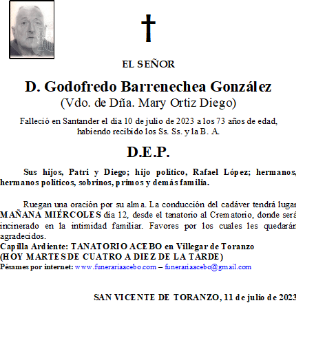 D. Godofredo Barrenechea González- San Vicente de Toranzo en 11 julio, 2023 por funerariaacebo Comparte esto: Haz clic para compartir en X (Se abre en una ventana nueva) X Haz clic para compartir en Facebook (Se abre en una ventana nueva) Facebook Me gusta Cargando... Relacionado