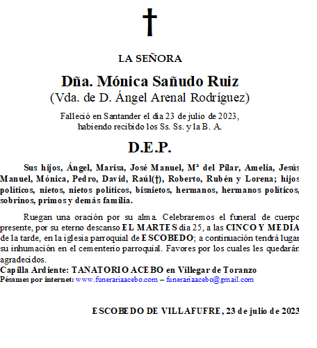 Dña. Mónica Sañudo Ruiz- Escobedo de Villafufre en 23 julio, 2023 por funerariaacebo Comparte esto: Haz clic para compartir en X (Se abre en una ventana nueva) X Haz clic para compartir en Facebook (Se abre en una ventana nueva) Facebook Me gusta Cargando... Relacionado