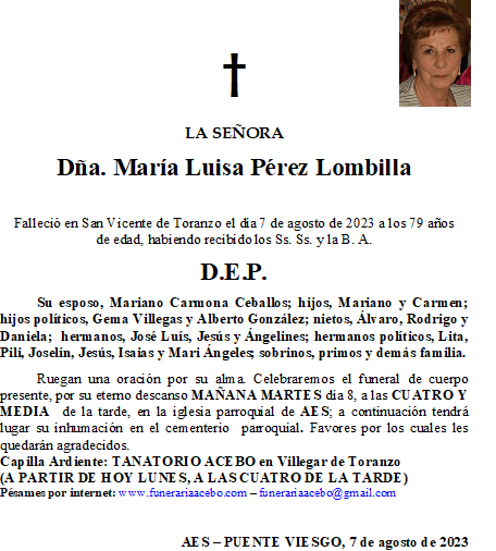 Dña. María Luisa Pérez Lombilla. Aes – Puente Viesgo en 7 agosto, 2023 por funerariaacebo Comparte esto: Haz clic para compartir en X (Se abre en una ventana nueva) X Haz clic para compartir en Facebook (Se abre en una ventana nueva) Facebook Me gusta Cargando... Relacionado