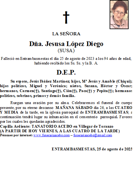 Dña. Jesusa López Diego (Susa)- Entrambasmestas en 25 agosto, 202325 agosto, 2023 por funerariaacebo Comparte esto: Haz clic para compartir en X (Se abre en una ventana nueva) X Haz clic para compartir en Facebook (Se abre en una ventana nueva) Facebook Me gusta Cargando... Relacionado