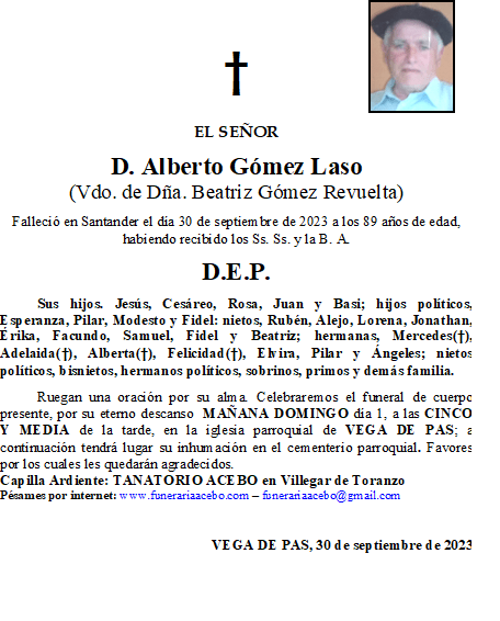 D. Alberto Gómez Laso- Vega de Pas en 30 septiembre, 202330 septiembre, 2023 por funerariaacebo Comparte esto: Haz clic para compartir en X (Se abre en una ventana nueva) X Haz clic para compartir en Facebook (Se abre en una ventana nueva) Facebook Me gusta Cargando... Relacionado