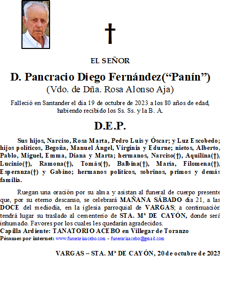 D. Pancracio Diego Fernández (Panín)- Vargas- Sta. Mª de Cayón en 20 octubre, 2023 por funerariaacebo Comparte esto: Haz clic para compartir en X (Se abre en una ventana nueva) X Haz clic para compartir en Facebook (Se abre en una ventana nueva) Facebook Me gusta Cargando... Relacionado