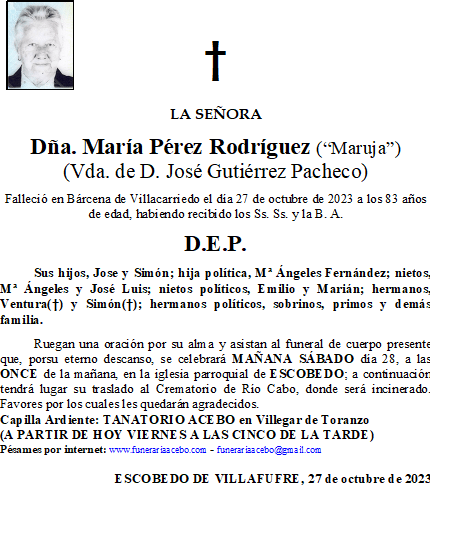 Dña. María Pérez Rodríguez («Maruja»)- Escobedo de Villafufre en 27 octubre, 2023 por funerariaacebo Comparte esto: Haz clic para compartir en X (Se abre en una ventana nueva) X Haz clic para compartir en Facebook (Se abre en una ventana nueva) Facebook Me gusta Cargando... Relacionado