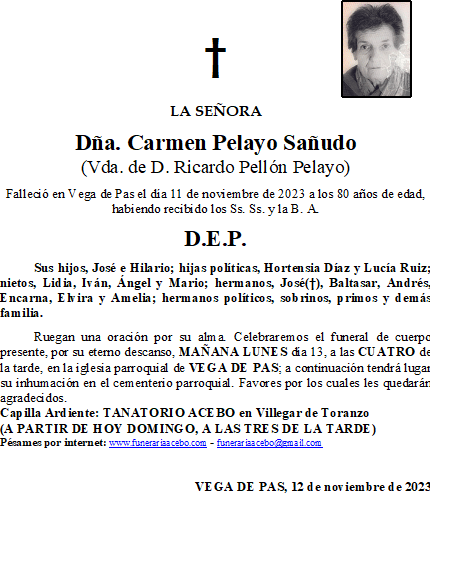 Dña. Carmen Pelayo Sañudo- Vega de Pas en 12 noviembre, 2023 por funerariaacebo Comparte esto: Haz clic para compartir en X (Se abre en una ventana nueva) X Haz clic para compartir en Facebook (Se abre en una ventana nueva) Facebook Me gusta Cargando... Relacionado