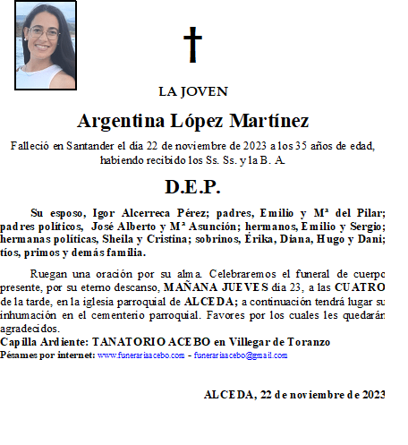 Argentina López Martínez- Alceda en 22 noviembre, 2023 por funerariaacebo Comparte esto: Haz clic para compartir en X (Se abre en una ventana nueva) X Haz clic para compartir en Facebook (Se abre en una ventana nueva) Facebook Me gusta Cargando... Relacionado