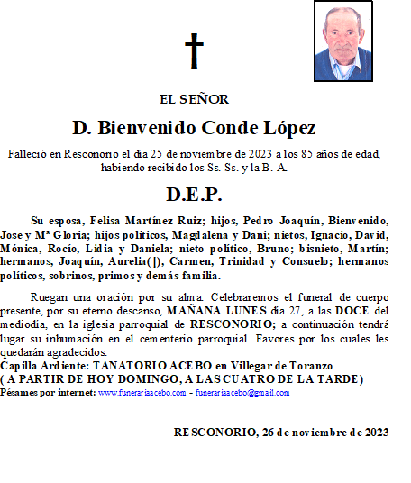 D. Bienvenido Conde López- Resconorio en 26 noviembre, 2023 por funerariaacebo Comparte esto: Haz clic para compartir en X (Se abre en una ventana nueva) X Haz clic para compartir en Facebook (Se abre en una ventana nueva) Facebook Me gusta Cargando... Relacionado
