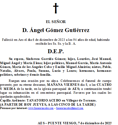 D, Ángel Gómez Gutiérrez – Aes en 7 diciembre, 2023 por funerariaacebo Comparte esto: Compartir en X (Se abre en una ventana nueva) X Comparte en Facebook (Se abre en una ventana nueva) Facebook Me gusta Cargando... Relacionado